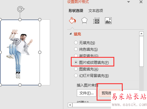5、選中左邊的圖片,右鍵選擇剪切,然后選中右邊的形狀,設置形狀格式,點擊填充,選擇圖片或紋理下面的剪貼板