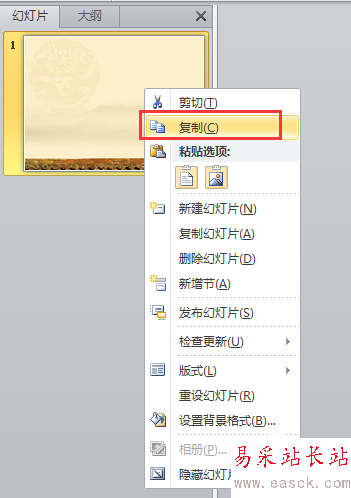 6、然后就在左邊幻燈片處,右鍵復制第一張幻燈片。