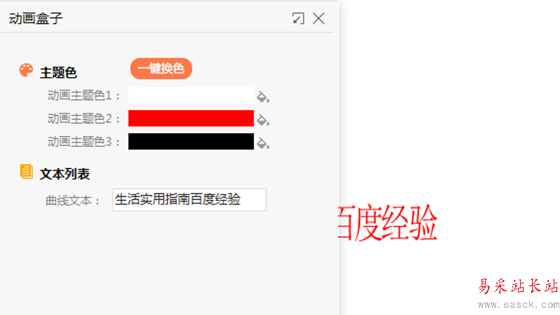 3、在動畫盒子中設置文本列表的曲線文本內容為“實用生活指南百度經驗”。