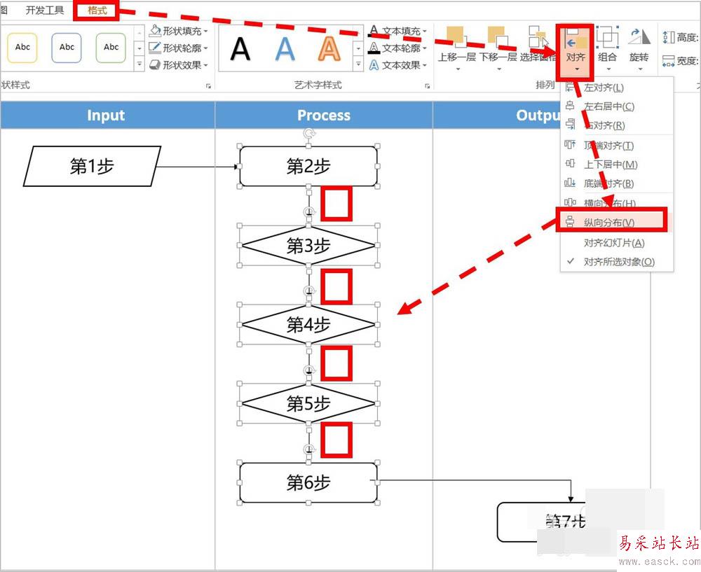 需要注意的是:這里的相同間距,不僅是各個圖形之間的間距相同,而是所有被選中的對象之間的間距相同(包括箭頭)。