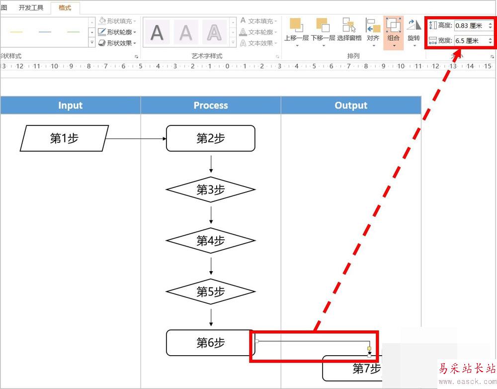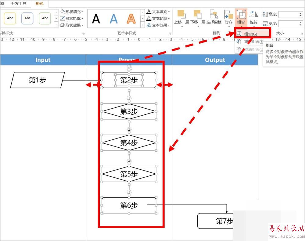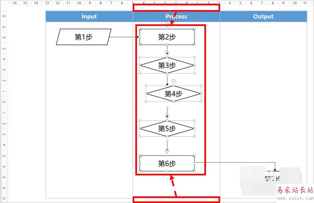 在對齊、調整間距后,我們還要將這些對象批量移動到表格的中間位置(Process下方)。