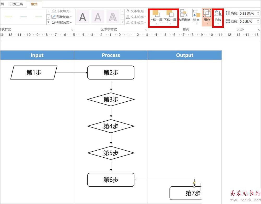7、通過"格式"菜單,我們還可以設置各個對象之間,誰放置于誰之上(或之下),以及快速的旋轉(90度、180度等等)。