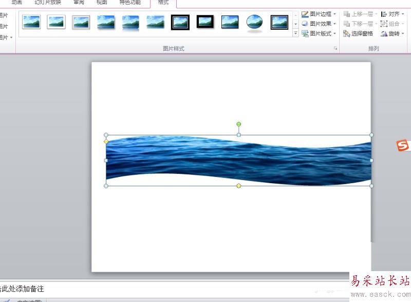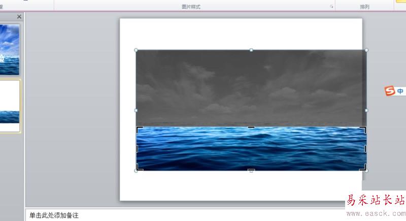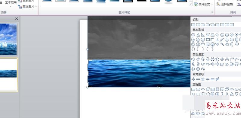 4、現在那我們以這張圖片作為背景。我們在插入一張剪切型的圖片。先進行新建一個空白版式的頁面。在空白的頁面里面插入同一張圖片。然后點擊圖片,再繪圖工具里面找到一個剪切。把這張圖片剪切只留下海水。剪切完成以后我們再插入一個波浪形狀。這樣這張剪切畫就基本制作完成。