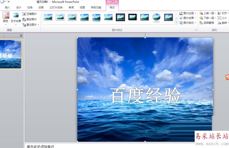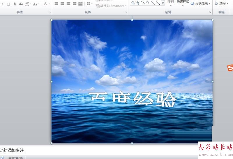 5、然后我們把這張剪切畫不就粘貼到我們的第一張PPT里面。把剪切畫放在圖片的上面使我們的海水可以遮擋住文字一半,這樣我們的百度經驗就用一種要石沉大海的感覺,在文字里面我們可以修改年終總結或者其他的文字。這樣 年終總結的封面圖就基本制作完成。