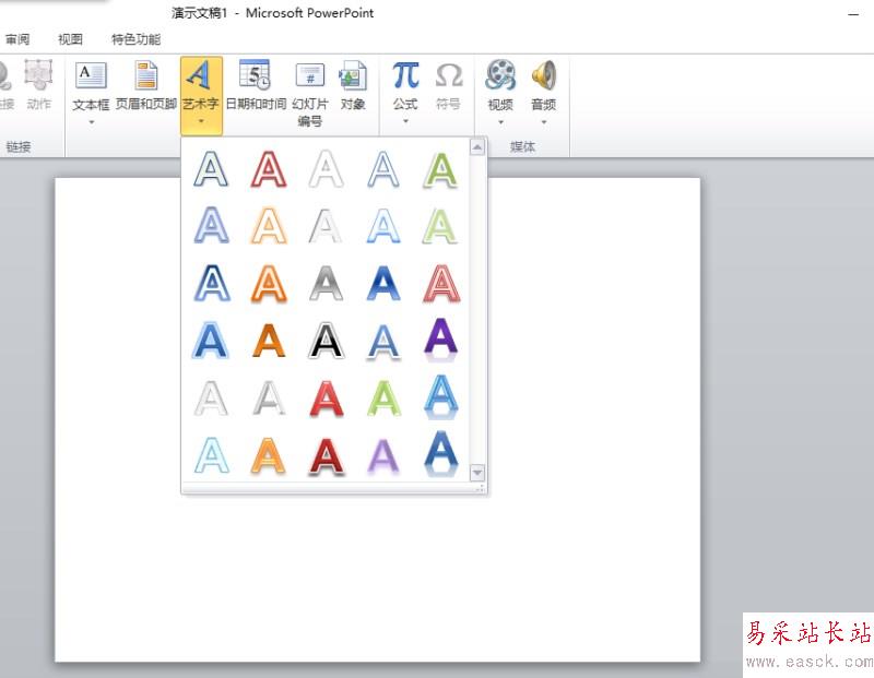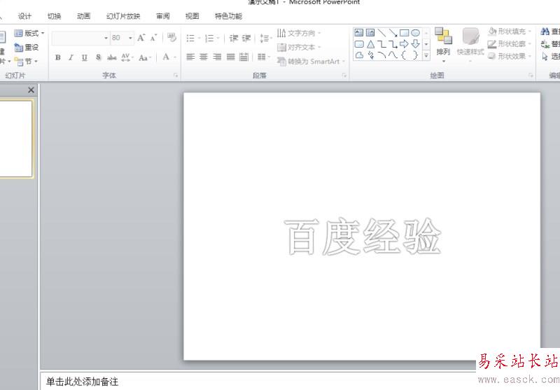 1、首先打開我們的PPT軟件。然后新建一個空白的版式頁面,在空白的版式頁面里面,我們插入藝術字。然后在藝術字里面輸入百度經驗四個字。進行演示操作,當然,你需要什么文字就進行輸入什么文字。