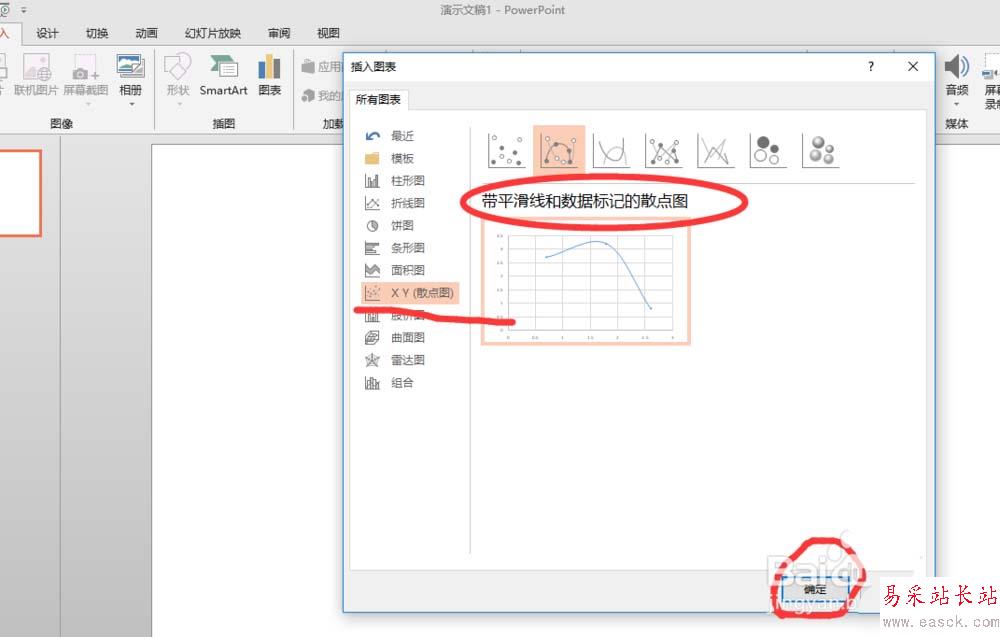 3、這里提供了平時我們常用的好多種圖表,選擇自己適用的一種,我這里選擇帶平滑曲線和數據標記的散點圖,好了之后單擊確定。