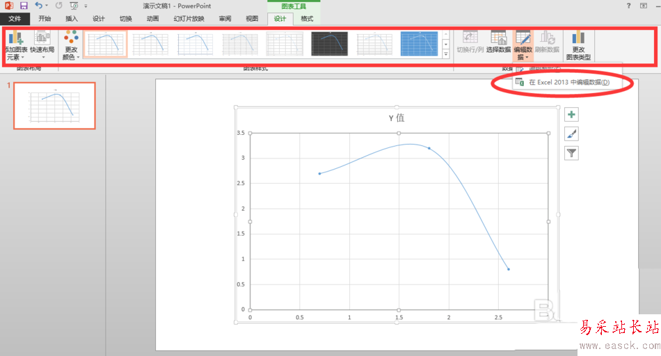 6、單擊選中圖表,在菜單欄設計中,可以對圖表進行進一步編輯。如編輯數據,可跳轉到excel編輯。