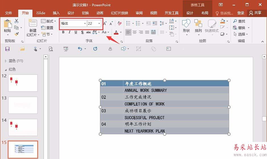 3、統一字體以及大小,這里就字體以楷體,大小就以22,然后縮小頁面(個人習慣),還有就是對齊一下文本,直接選擇表格內容即可。