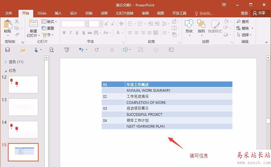 2、在表格內容,輸入文本信息,這里就以實際的工作PPT來進行,(為什么是插入表格,后續的作用會說到)。