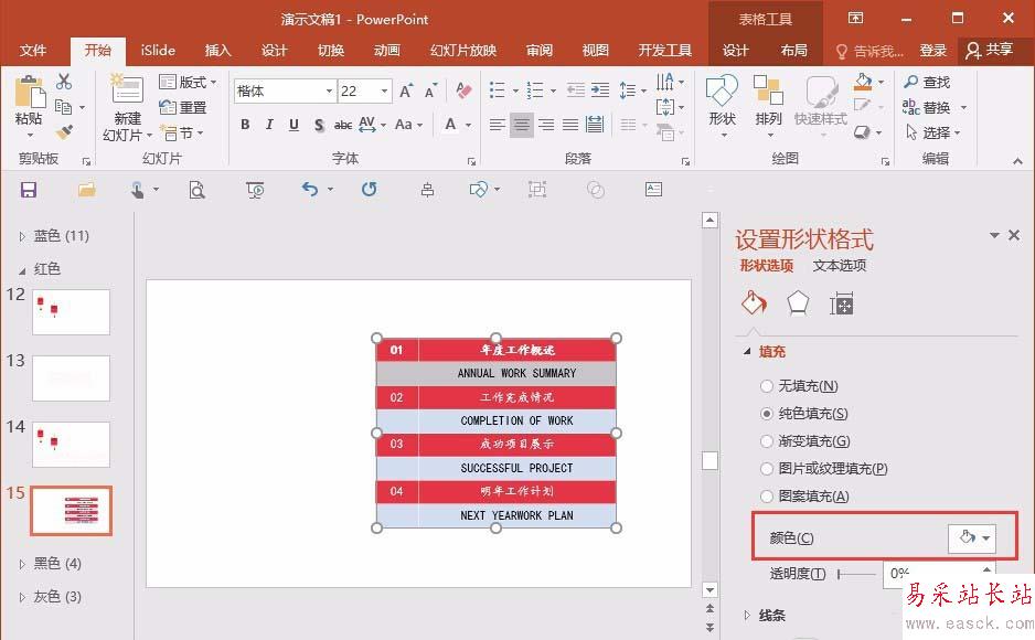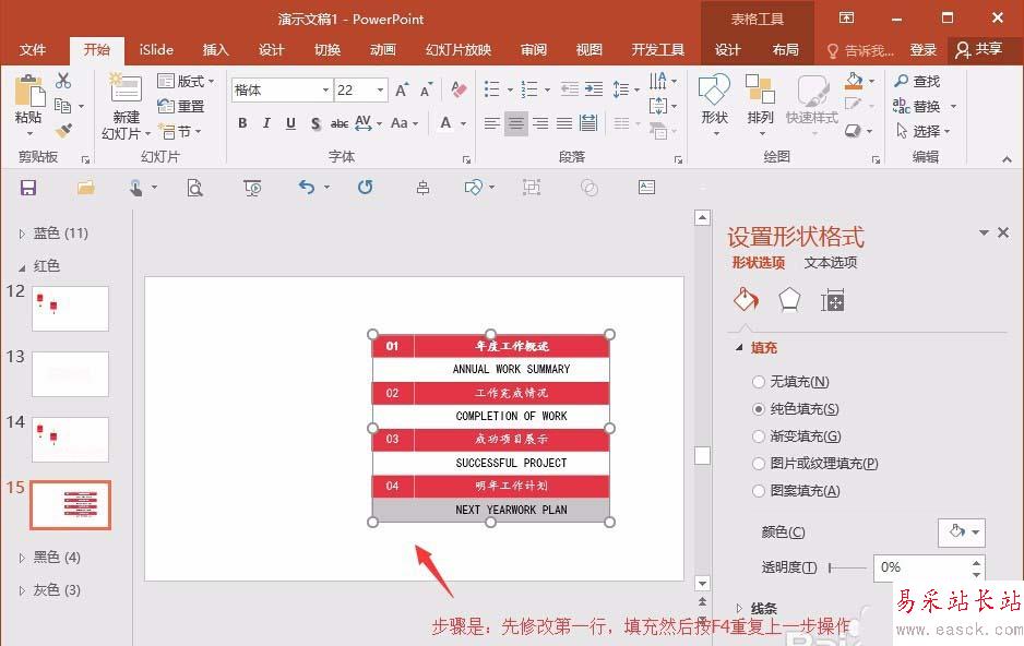 5、為了更加符合背景以及場景要求,我們可以改為紅跟白作為填充,快速的操作方法為先現在修改第一行表格,然后按F4進行一個重復操作。