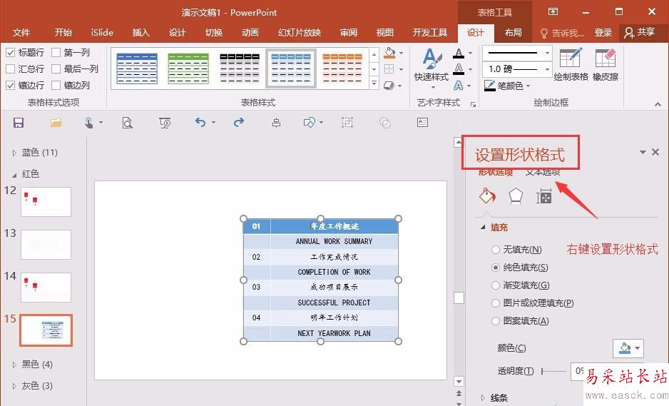 4、選擇表格,然后是右鍵設置形狀格式,我們需要更改一下背景的填充顏色,比如背景顏色填充為紅色(所有對象在PPT都是可以改動的)。