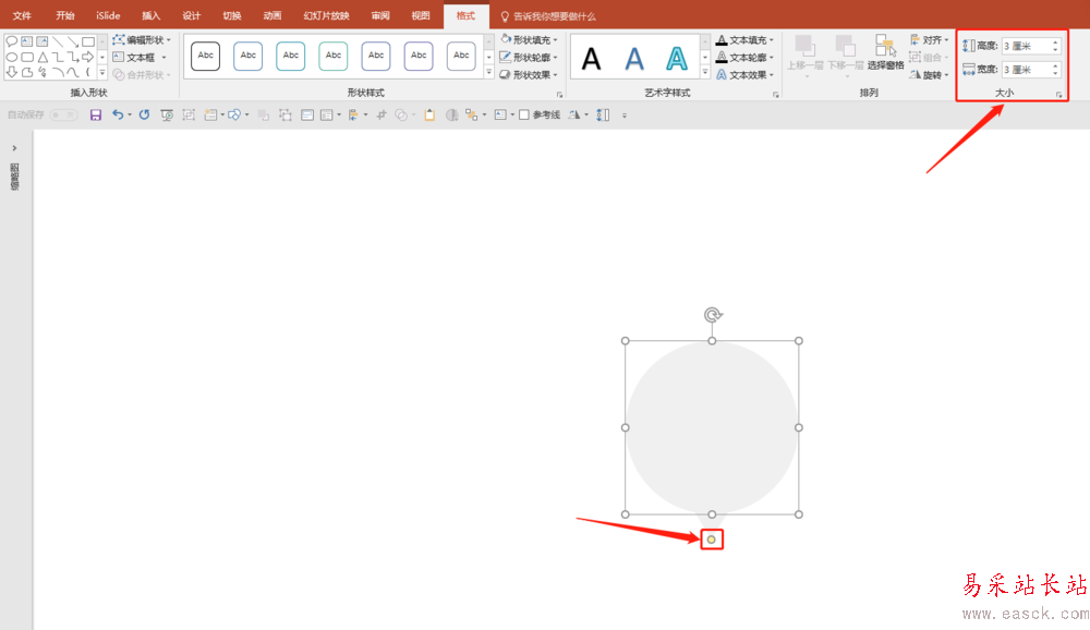 3、因為默認是橢圓形所以需要在【大小】里面調節高度=寬度;調節【控點】即氣泡左下方的黃色小圓點到正下方;修改形狀顏色為【灰色】。