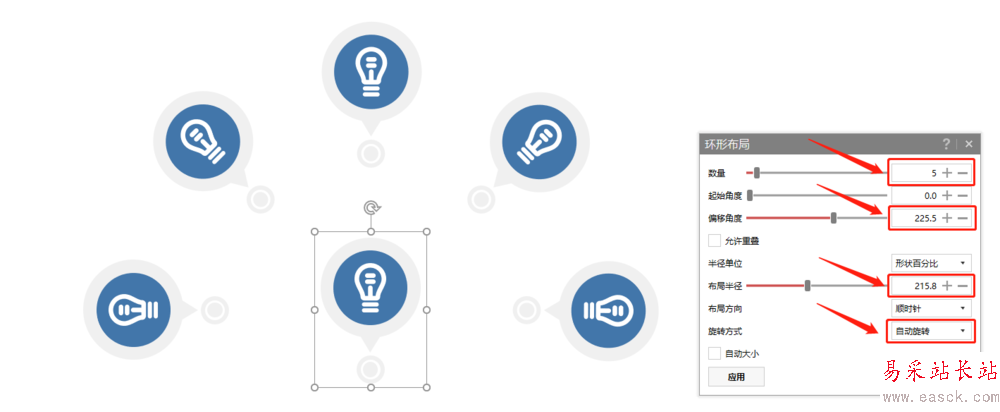 8、選中組合后的圖形,打開【環形布局】工具。設置【數量】為5;設置【旋轉方式】為自動旋轉;設置【布局半徑】,可自行調節到合適數值;設置【偏移角度】,可自行調節到合適數值。