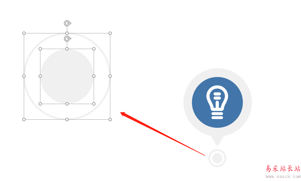 7、插入兩個大小不等的圓形。大圓設置邊框顏色為灰色,填充色為白色;小圓設置無邊款色,填充色為灰色。放置到氣泡的正下方,全選形狀和圖標,【組合】。