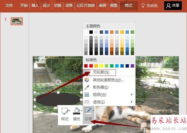 8、接著還是右擊橢圓,點擊邊框,選擇“無輪廓”。