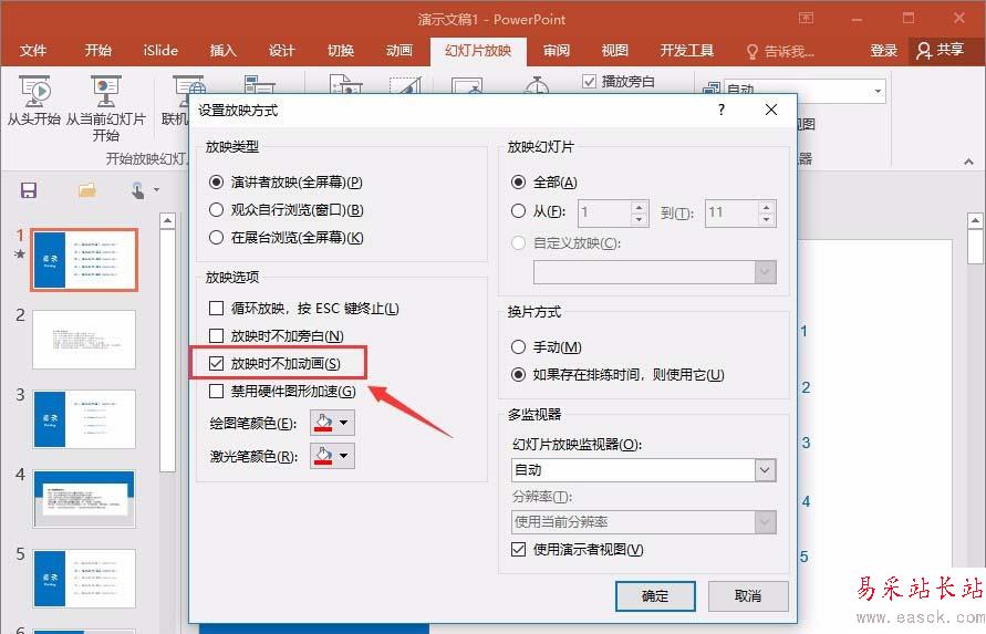方法三:所以為了解決不播放動畫,又保留動畫效果,有了這第三種的方法,那就選擇幻燈片——幻燈片放映——設(shè)置——把放映時不加動畫勾選上,即可解決問題。