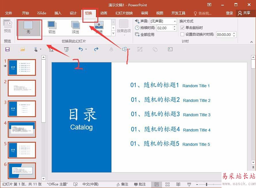 但上面的隱藏PPT動畫效果,只對于對象動畫有效,對于切換的動畫,就不能去掉效果了,所以如果幻燈片中,也加入了切換動畫,那么就需要使用下面的方法來解決。