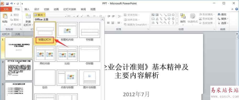 2、單擊“開(kāi)始”選項(xiàng)卡下的“版式”下拉按鈕,選擇“標(biāo)題幻燈片”