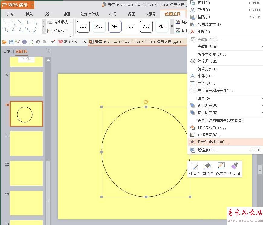 2、按住shift鍵,拖動鼠標在頁面內插入圓形,在圓形上右擊,在彈出的頁面上選擇“設置對象格式”。