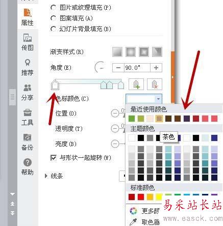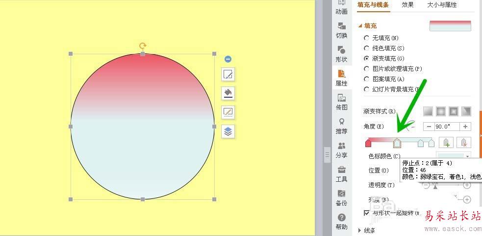 4、如圖2箭頭所示,點擊第一個游標的標點,在右側選擇自己的顏色。我們可以看到圖形的顏色發生了改變,出現了漸變。
