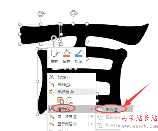 7、再次按住【shift】鍵,選中【百】字左半邊,鼠標右擊選擇【組合】-【組合】