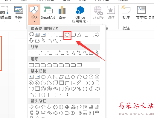 3、點擊形狀選項在其下拉菜單里找到橢圓選項,如圖所示: