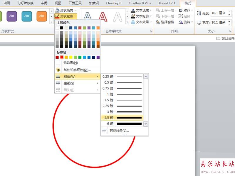2、選擇正圓,執行格式-形狀填充命令,設置填充顏色為無顏色填充,形狀輪廓為紅色,粗細為4.5磅。