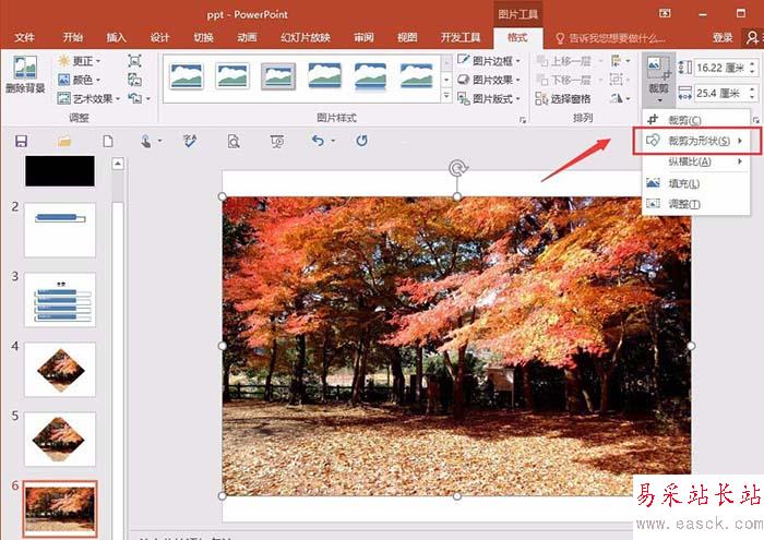 方法三:利用PPT裁剪功能,先插入圖片——圖片工具,格式——裁剪為形狀——選擇想要的形狀樣式——確定即可完成效果。