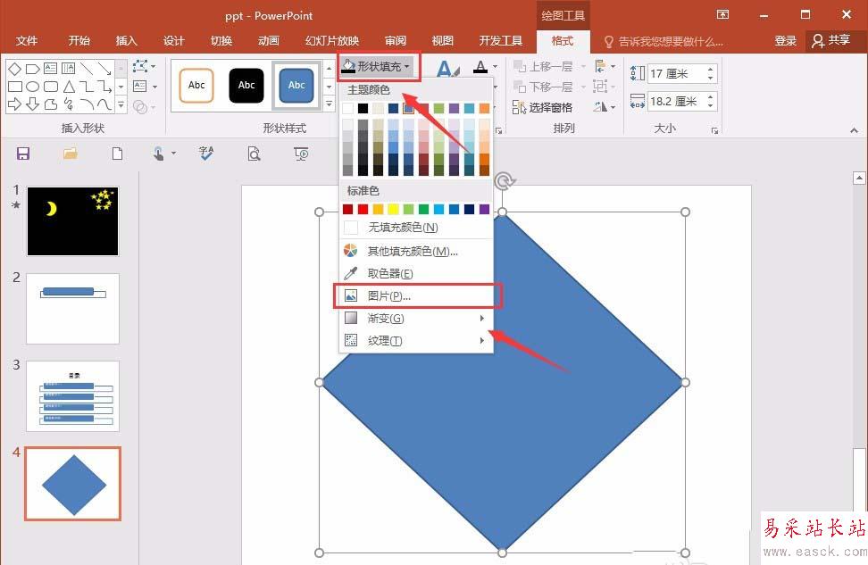 方法一:利用填充,插入形狀(隨意,這里以四邊形來演示)——形狀填充,選擇圖片——選擇本地桌面圖片,找到位置——即可完成效果