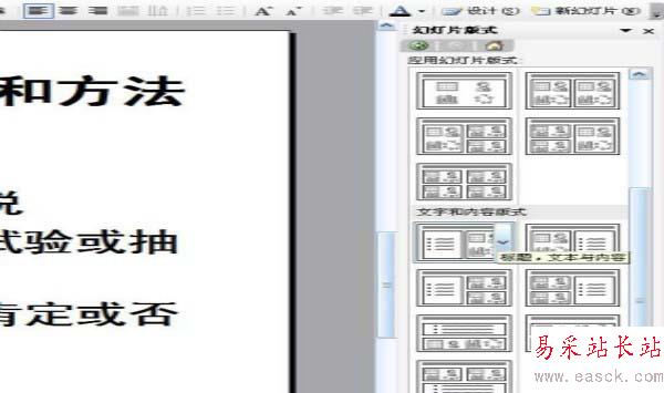2、在版式中選擇“標(biāo)題,文本與內(nèi)容”,鼠標(biāo)移到上方即可。