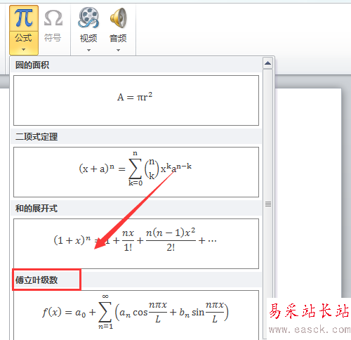 4、點擊公式選項下面的下拉箭頭,在其下拉菜單里找到傅里葉級數選項,如圖所示: