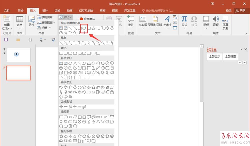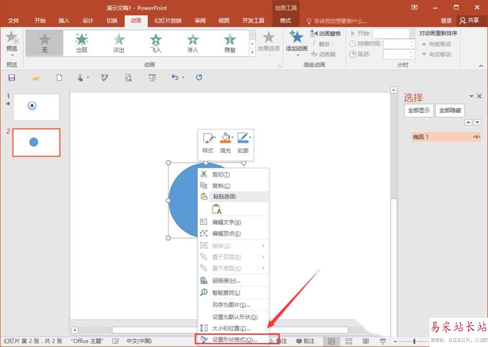 1、先新建一個PPT空白幻燈片,選擇插入一個橢圓(按住shift可以畫出正圓),之后我們設置一下形狀格式,填充選擇漸變填充。