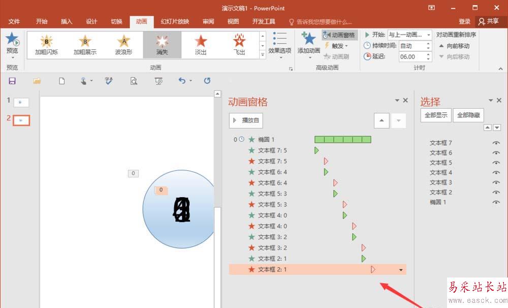 5、之后再對4-0這5個數字,以此插入動畫,都是選擇一樣“出現”與“消失”,不同的地方在于,“消失”動畫的設置,5延遲1秒,4延遲2秒,3延遲3秒,以此類推。