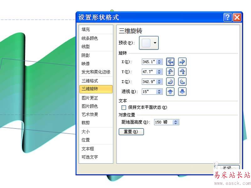 6、執(zhí)行threed-頂?shù)紫嘟用睿俅握{(diào)出設(shè)置形狀格式對話框,設(shè)置x為345.1,y47.7,z342.9,透視15.