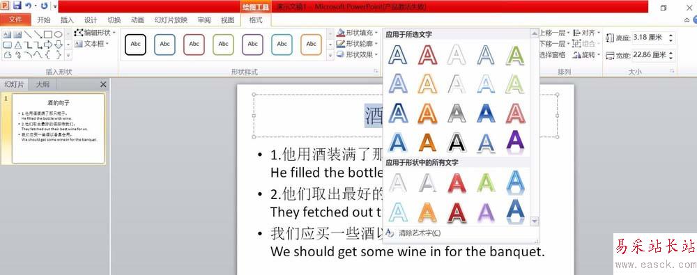 3、點擊示例藝術字右下角的下拉框,將出現部分常用的藝術字樣式,這時我們點擊選擇自己所需要的藝術字樣式即可應用到所選文字了,如下圖即為隨機選用的一種藝術字樣式。