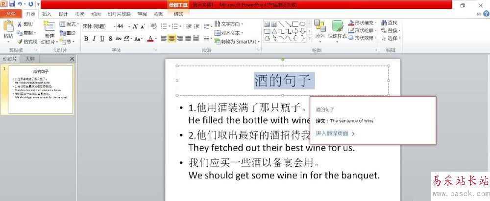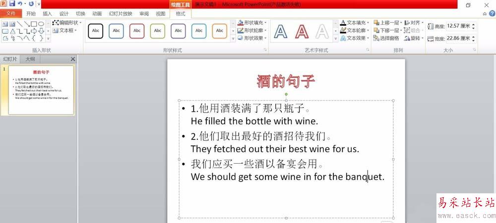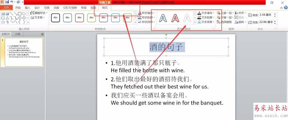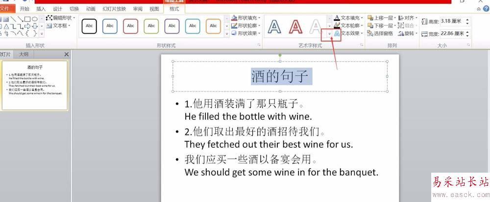 1、首先,我們需要將文字輸入進文本框中。并選中需要制作成藝術字的文字,如下圖所示,我們選中“酒的句子”等幾個字,用它來演示如何制作成藝術字體。