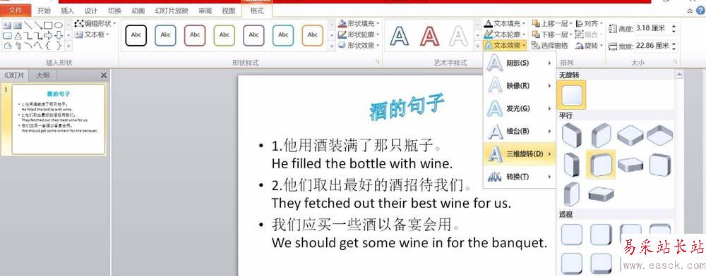 6、如果藝術字需要帶旋轉、張揚等效果的話,我們還可以在“文本效果”中為其設置“陰影”、“發光”、“三維旋轉”等效果,如圖所示為設置了某種三維旋轉效果后的圖片。