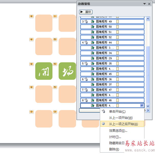 7、采用同樣的方法依次添加動畫,形成一個回字形狀,依次設置效果選項,調出動畫窗格,選擇所有的動畫,設置從上一項開始之后開始,播放查看效果。