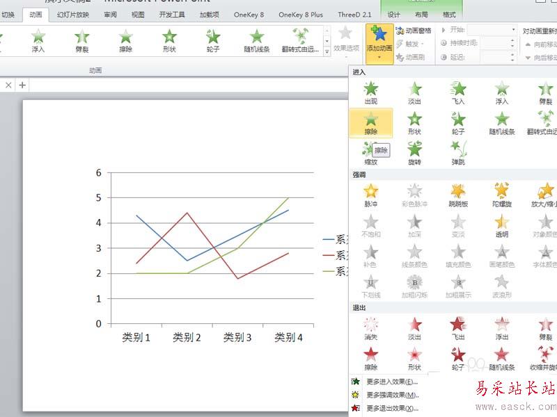2、選擇圖表,執(zhí)行動(dòng)畫(huà)-添加動(dòng)畫(huà)命令,從中選擇進(jìn)入中的擦除動(dòng)畫(huà)。