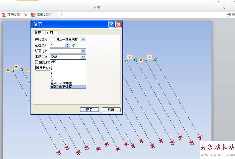 7、選擇兩條直線,多次復制并調整他們的相對位置,設置重復為直到幻燈片末尾,播放查看動畫效果。