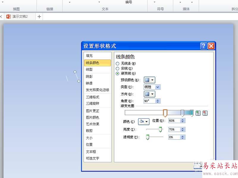 3、設置直線的形狀輪廓為白色,采用同樣的方法再次插入直線,并設置為漸變線。
