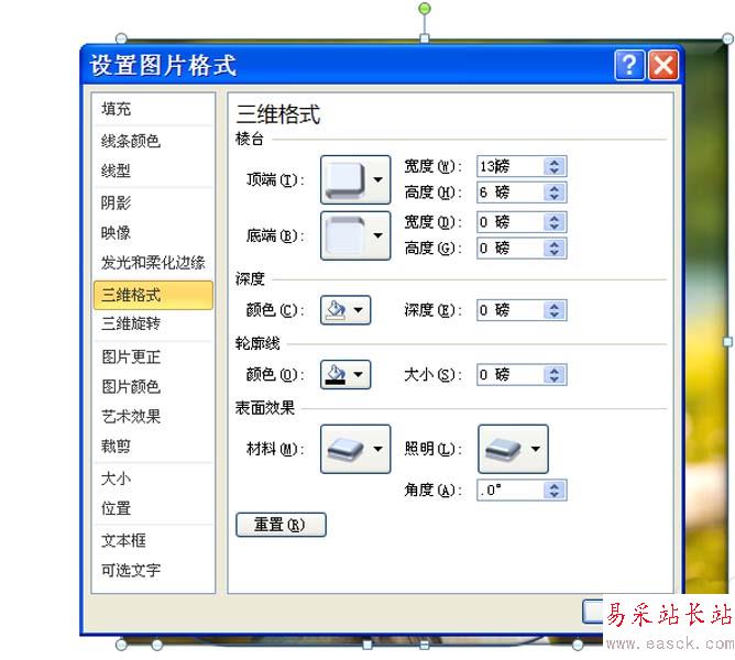 4、右鍵單擊矩形從中選擇設置圖片格式選項,切換到三維格式,設置頂部棱臺寬度為13磅。