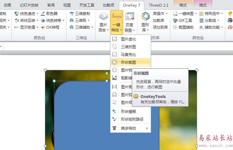 3、ctrl+a全選,執行onekey-一鍵特效-形狀裁圖命令,查看效果變化。
