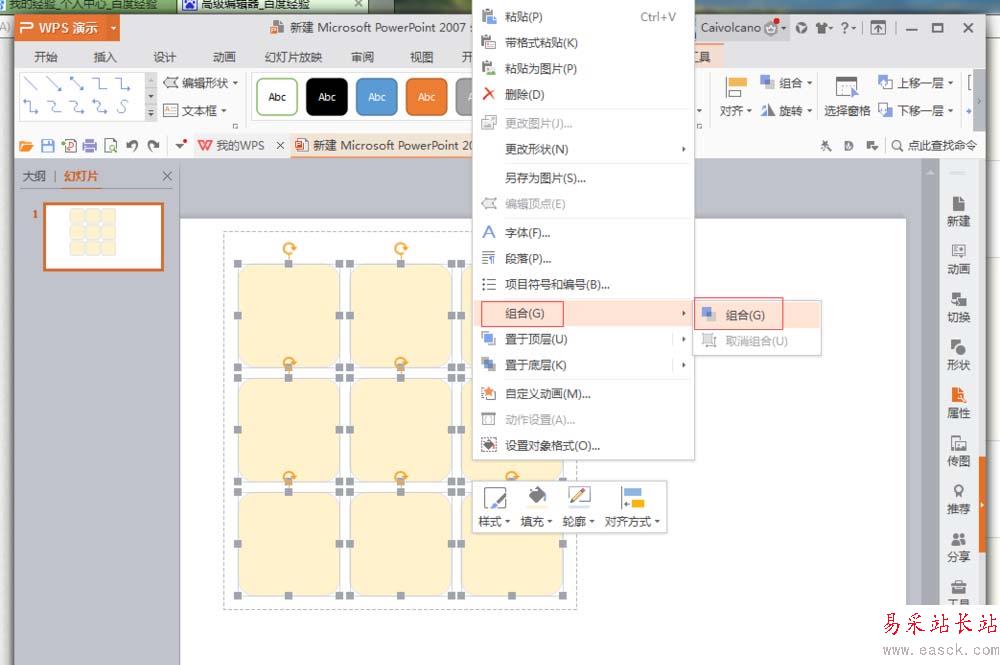 5、右擊,選擇組合。在步驟4的圖片下面選擇九個矩形之后上面有一行小處理工具,最后一個也是組合。