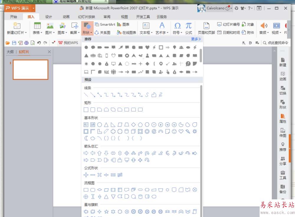 1、打開一個PPT,然后新建一張幻燈片,我們利用插入形狀的方法,選擇這個九宮格每個格子的大小形狀。