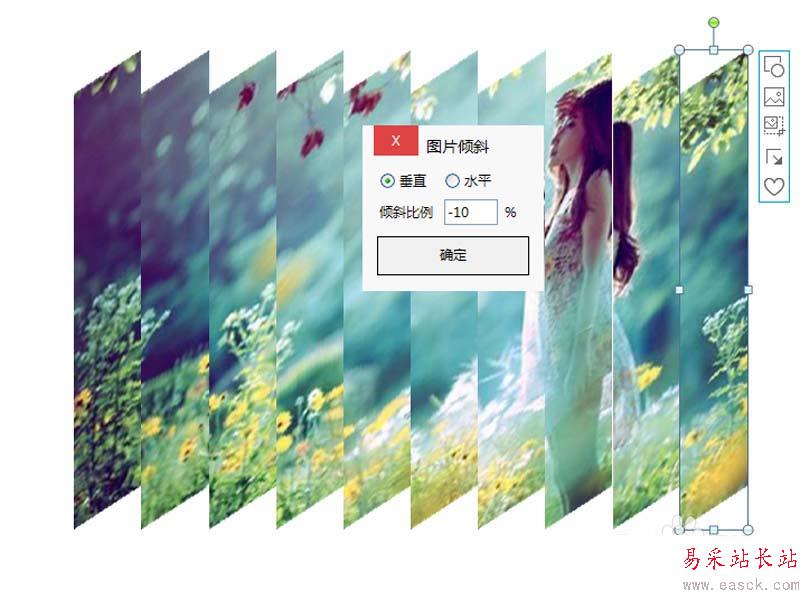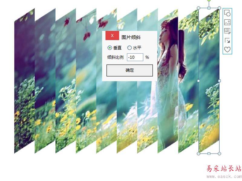 3、執(zhí)行全選命令,執(zhí)行一鍵特效-圖片傾斜命令,設(shè)置傾斜比例為-10,點(diǎn)擊確定按鈕。