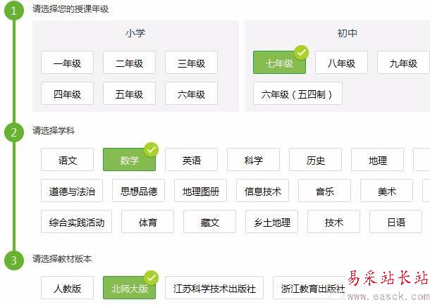 4、年級(jí)、學(xué)科和版本分別選擇:7年級(jí)、數(shù)學(xué)、北師大版本,進(jìn)入下一步。