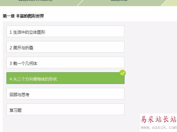 5、選擇章節(jié),第一章豐富的圖形世界,從三個(gè)方向看物體的形狀。這樣課程就選擇好了,單擊開(kāi)始制作按鈕。