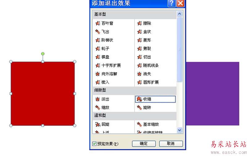 5、選擇第一個(gè)正方形,執(zhí)行動(dòng)畫-添加動(dòng)畫命令,選擇更多退出動(dòng)畫里的收縮動(dòng)畫,修改持續(xù)時(shí)間為0.25.