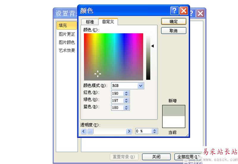 2、設置純色填充,設置顏色為自定義顏色,紅色為190,綠色為197,藍色為180,點擊確定按鈕。